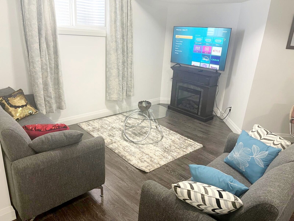Spacious and serene suite w gas fireplace, House at the circle of the street, a 10 minute walk to peaceful fishing pond and all amenities. Skyline Diamond Baseball park, Kids Hockey arena, Skateboard park, outdoor skating rink, and Curling Club, all 7 minutes walk. Sobeys grocery store 10 minute walk away. Firepit in the backyard with gas Barbeque on the back deck for your private use. Cozy FP & in-floor heating w 2 bedrooms, 1 bathroom, kitchenette, dinette, living room with TV live stream.