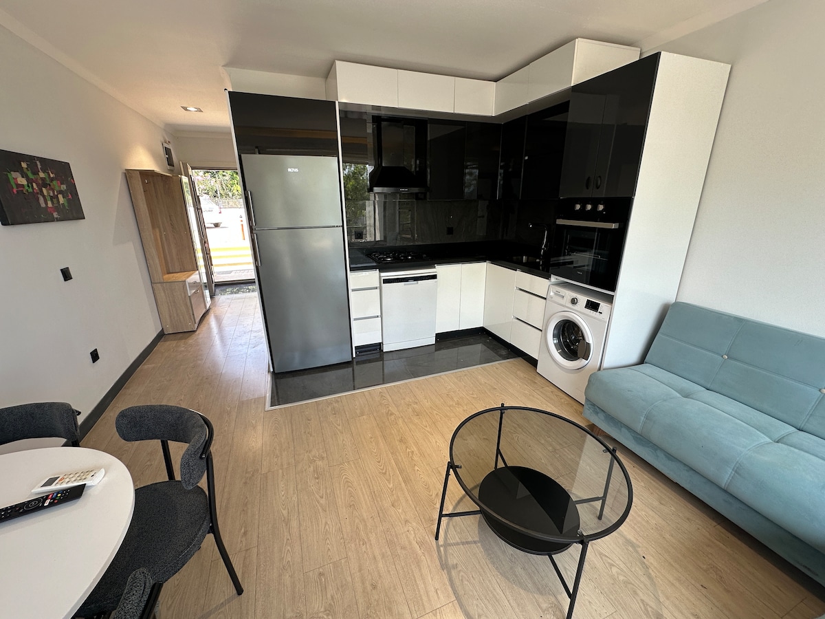 Evimiz müstakil girişli tek katlı 1+1 dir. Klima, smart tv, çamaşır makinası, buzdolabı, bulaşık makinası Türk kahvesi makinası, nescafe makinası, tencere tava vs. mevcut. Denize, havuza ve plaja 300 metre uzaklıkta. Bim, Migros, A101, Tedi gibi kurumsal mağazalara 50 metre uzaklıkta. Otobüs, minibüs ve taksi durağı hemen evin önünde. 1 adet çift kişilik yatak ve salonda çek yat özellikli kanepe mevcuttur. Girişte, Rezervasyonu yapan kişinin kimlik bilgisi alınır