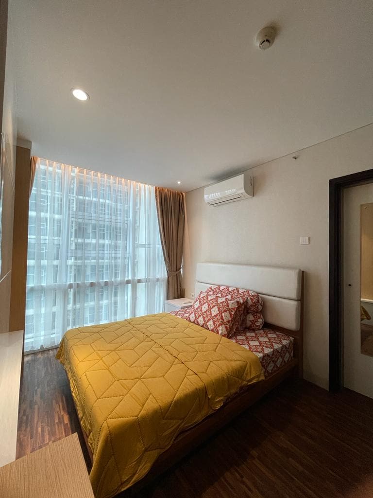 New, modern, cozy & clean apartment. It's perfect for a small family. Located on 27th floor offers you a view of the entire city town below. Numerous windows throughout making it full of natural light. Corner apt with 28 sqm (net) has 1 bedroom and 1 living room unite with kitchen and dining area. Bed room is equipped with bedframe, SERTA mattress and wardrobe. Living room is equipped with sofa bed, dining table, 2 chairs, kitchen cupboard, stove, hanging TV. All rooms have AC.