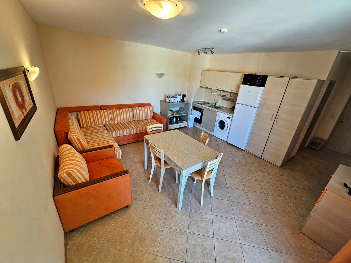 Բարի գալուստ Սանի Բիչ/Նեսեբար Մենք ձեզ առաջարկում ենք լիովին կահավորված հանգստյան բնակարան ՝ 57 մ2 մակերեսով, որը հարմարավետորեն տեղավորում է 4 հոգանոց ընտանիք ։ Բնակարանը գտնվում է Նեսեբիրում գտնվող Sunny View Central համալիրում ՝ նորաոճ բնակարանների համայնքում, որը վերաիմաստավորելու է նրբագեղ տոնական կյանքը ։ Համալիրում կան լողավազաններ, մարզասրահներ, երեխաների համար նախատեսված խաղահրապարակ, բար ընդունարանում և ամառային բար հիմնական լողավազանի մոտ ։