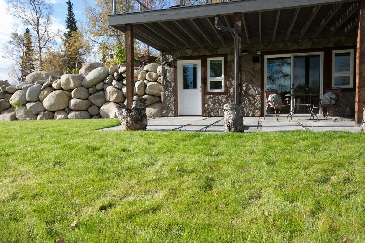 Bright, modern, clean and close to Palmer and Wasilla, major roads and Hatcher Pass trails, this basement walkout studio is a perfect stopover or home base. You'll enjoy - A mud room for gear, kitchen with coffee/creamer/tea/oats and bathroom with shower. Sleeping for 4 people- 2 single beds joined, foldout couch and floor mattress. Laundry, TV, Wifi, dining patio with views and trail accessibility. 1hr to Anchorage, 15 min to towns, 5 min to trails. Ask about loaner fishing rods (2)!