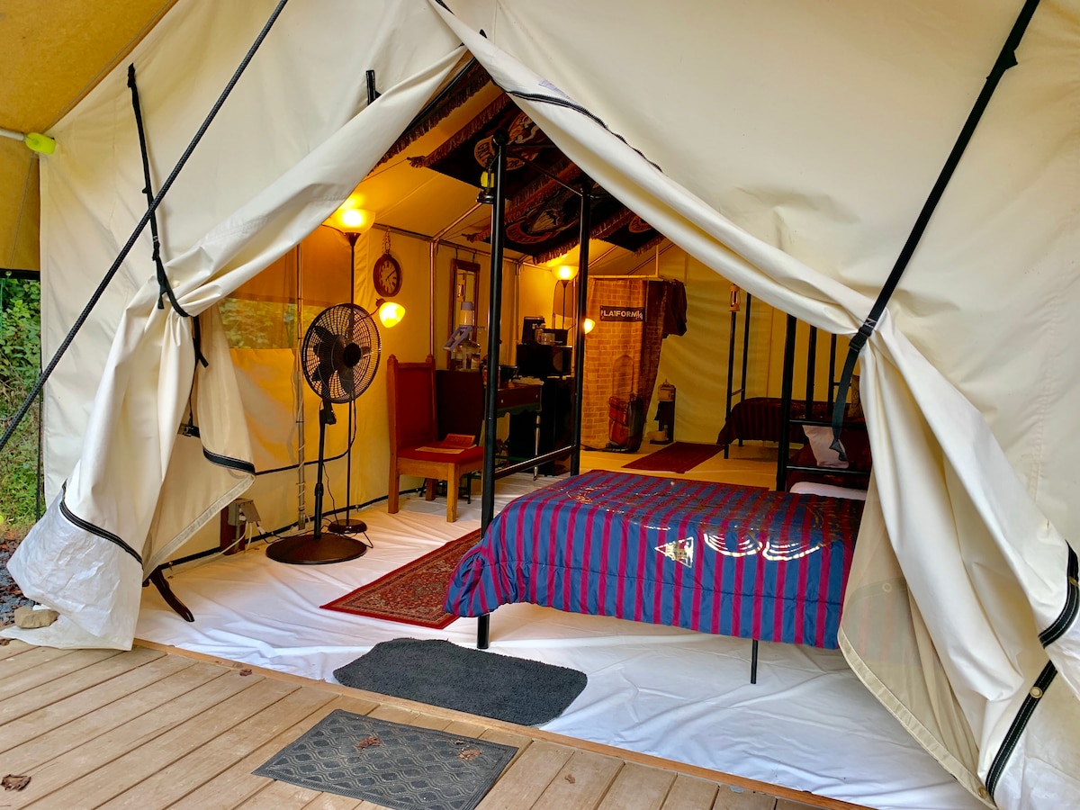 Այս սաֆարի վրանը գլամի սահմանումն է: Տախտակամած է խաղողի բերքահավաք խաղողի բերք ’50s - ի, կահույքի, մորթի, փետուրների, pinks, golds, եւ քրոմ. Գլամը հրապուրում է 50 - ի և Մերիլին Մոնրոյի սիրավեպը: Լուսավորությունը տաք է և հարմարավետ, իսկ մահճակալները ՝ շքեղ: Մեկ թագուհի և երկվորյակ w/ trundle daybed (գել հիշողության փրփուր ներքնակներ): Փոքր լվացարան, ջուր, կուպոնով սրճեփ, միկրոալիքային վառարան, մինի - սառնարան, ավտոտան զուգարան *՝ գիշերային հարմարավետության համար (սեզոնային ՝ օդափոխիչներ, ջեռուցիչ, տաքացվող վերմակներ )։ (Այս հարկաբաժնում ՏՆԱՅԻՆ ԿԵՆԴԱՆԻՆԵՐ չկան)