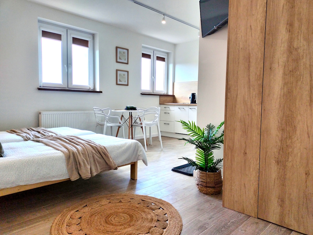Trzyosobowy apartament typu studio z trzema osobnymi łóżkami oraz możliwością dodatkowego łóżeczka dziecięcego, łazienką z prysznicem typu walk in oraz w pełni wyposażonym aneksem kuchennym (płyta indukcyjna, zmywarka do naczyń, ekspres do kawy, kuchenka mikrofalowa, czajnik elektryczny, zastawa stołowa, kubki, szklanki, kufle, kieliszki, garnki, patelnie).