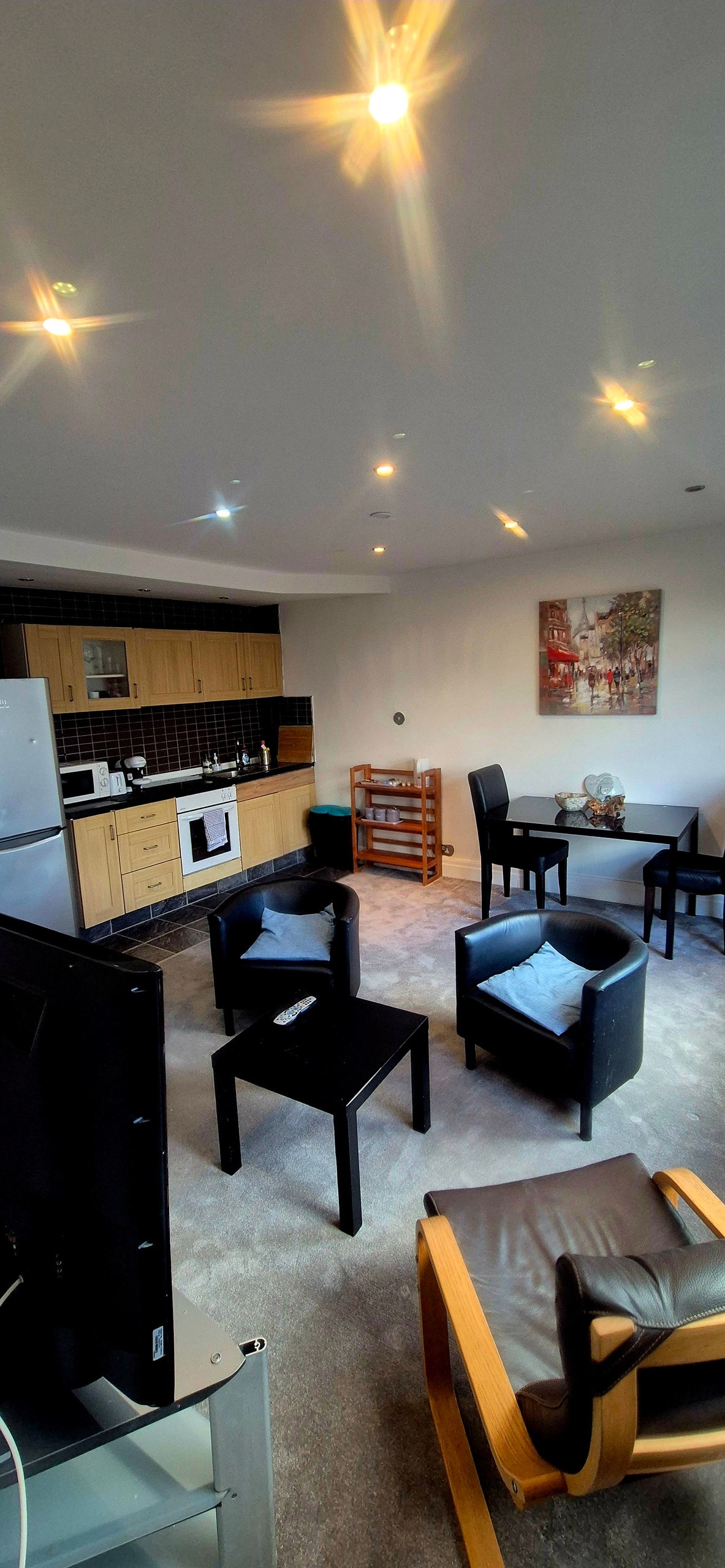 Մեծ, բաց հատակագծով, նորաձև բնակարան, քաղաքից մեքենայով 10 րոպե, AO արենա, RHS Bridgewater, Սալֆորդ Քվեյզ։ Արագընթաց ավտոբուսով 20 րոպե։ Երկաթուղային կայարանից մինչև քաղաք 5 րոպե քայլելու հեռավորության վրա։ Ժամանակակից հյուրասենյակ-սննդասենյակ և առանձին աշխատասենյակ՝ հանգստանալու և լիցքաթափվելու համար։ Կաշվե աթոռներ և հարմարավետ ճաշասեղան 2 հոգու համար, ինչպես նաև՝ տակավին վերցնելու տարբերակներ, խանութներ և սրճարաններ դրսում։ Մեծ 55դյույմանոց թվային հեռուստատեսություն ՝ ազատ դիտումով և Wi - FI - ով ։ Մեծ ննջասենյակում կա 190x203 սմ չափերով մեմորի փափուկ ներքնակ և պահարան։ Առանձին լոգասենյակ՝ լոգարանով և ցնցուղով։