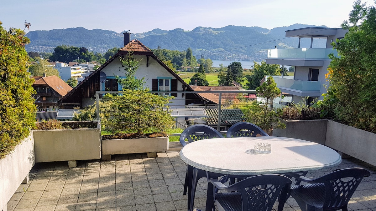 Հին Վեվի քաղաքում գտնվող մեր «Դուպլեքսը» կարող է տեղավորել մինչև 5 մեծահասակի ՝ գումարած 2 փոքր երեխա ։ 1 - ին հարկում կա մեծ լոգասենյակով առանձնաբաժին, իսկ 2 - րդ հարկում ՝ երկու առանձին սենյակ ՝ ընդհանուր ցնցուղարանով/օդորակիչով, և խոհանոց ՝ ճաշասենյակով ։ Խոհանոցն ունի անմիջական մուտք դեպի շատ մեծ ընդհանուր կտուր ՝ բարով և գրիլով ։ Լճի տեսարան բոլոր սենյակներից ։ Լողացեք լճում ՝ անմիջապես տան դիմաց ։ Ավտոմեքենայի ազատ գոտի, մոտակայքում հասարակական տրանսպորտ, խորհուրդ է տրվում հեծանվավազք: