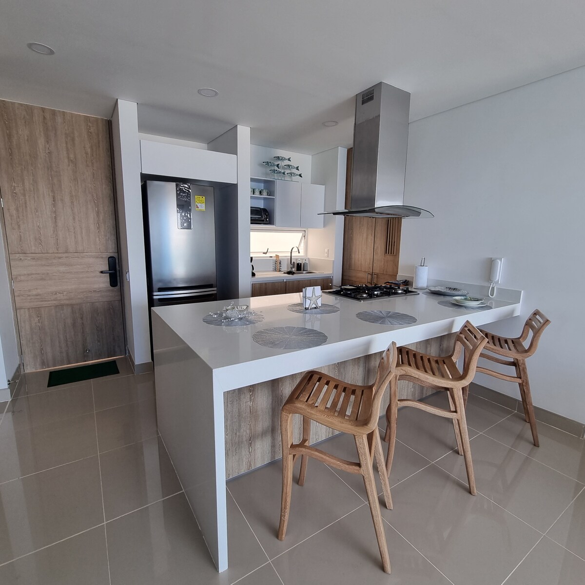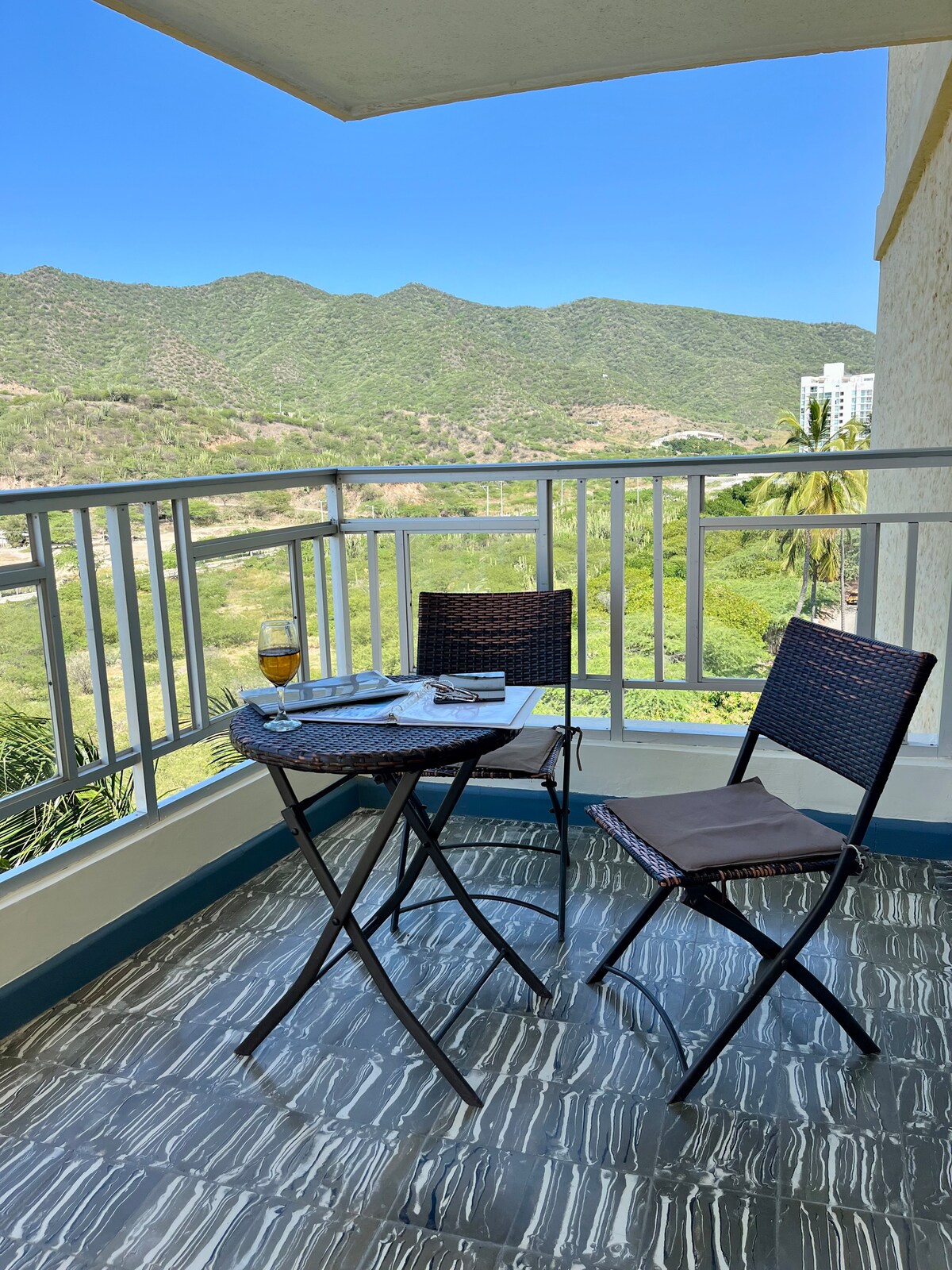 Տպավորիչ բոլորովին նոր ժամանակակից բնակարան 17 - րդ հարկում ՝ ծովի տեսարանով և դեպի լողափ ուղիղ մուտքով ։ Հանգիստ, հանգստանալու և (կամ) աշխատելու համար հաճելի տարածք: 10 րոպե դեպի միջազգային օդանավակայան և Սանտա Մարտայի պատմական կենտրոն, որը մոտ է ռեստորանների, բարերի, առևտրի կենտրոնների և դեղատների տարածքին: Մեկ ժամից էլ քիչ հեռավորության վրա գտնվող Թայրոնա ազգային պարկից, Տագանգա, Մինկա ։ Բնակարանն ունի մեծ պատշգամբ, որտեղ կարող եք վայելել Կոլումբիայի լավագույն մայրամուտը ։