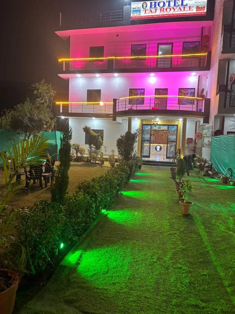 1. Hotel Taj Royale (Located in Taj Nagri, Phase 1) This is a 3-star property known for its proximity to the Taj Mahal (approximately 2.4 km away). Amenities: Free Wi-Fi access. Complimentary private parking. On-site restaurant. 24-hour front desk and reliable room service. Air-conditioned and family-friendly rooms. Garden and terrace areas for relaxation. Dining: The hotel offers an American buffet breakfast, along with Chinese, Indian, local, and pizza options at its restaurant.