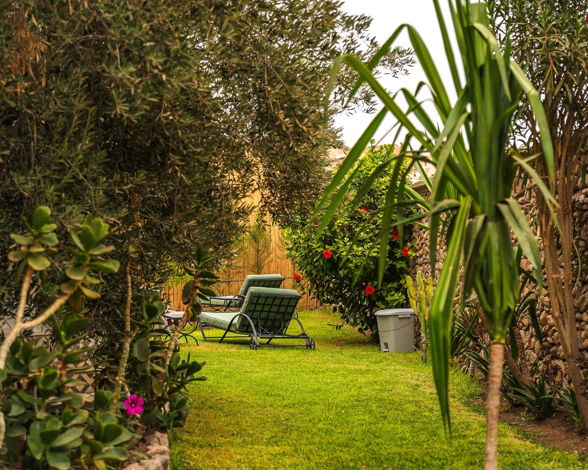 You enter a Berber-style house that blends traditional charm with modern comfort. The authentic architecture is distinguished by its high ceilings and large windows, allowing natural light to flood the space. Inside, everything has been designed with your comfort in mind: reversible air conditioning, Wi-Fi, and a refrigerator. Outside, a lush garden flourishes under the majestic gaze of the Atlas Mountains, creating a unique atmosphere where tradition and modernity come together in harmony.