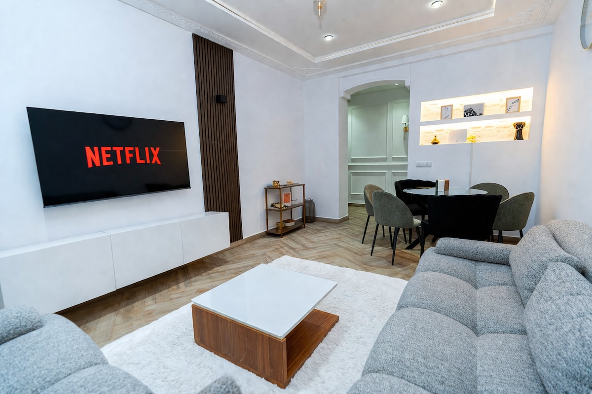 Վայելեք 5 աստղանի հարմարավետություն այս նորաձև 3 սենյականոց, վերին հարկի լյուքսում՝ Թանժերի սրտում 🌊 Հիասքանչ տեսարաններ դեպի քաղաք և մասամբ դեպի ծով, հիլթոնյան ոճի դիզայն և տարածք մինչև 6 հյուրի համար։ Վայելեք կենտրոնական օդորակիչը, լիովին կահավորված խոհանոցը, արագ Wi-Fi-ը և առանձին կայանատեղին 🅿️՝ առանց հոգսերի մնալու համար։ Մի քանի քայլ հեռու Tangier City Mall առևտրի կենտրոնից, լողափից և TGV կայարանից 🚆, իդեալական ընտանեկան հանգստի, ռոմանտիկ հանգստի, գործնական ուղևորությունների կամ հանգստյան օրերի համար՝ ուսումնասիրելով հիասքանչ Հյուսիսային Մարոկկոն և նրա ծովափը։