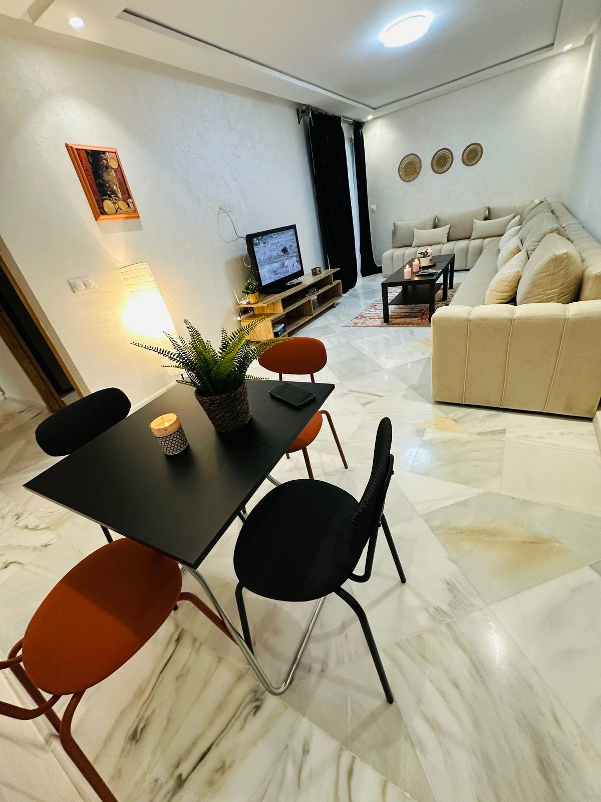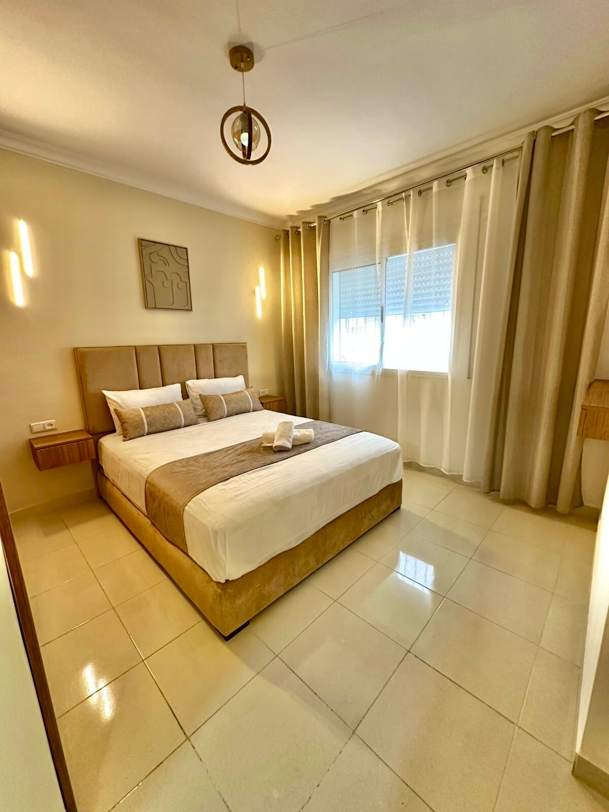 This charming luxury apartment is located in the heart of Tangier’s Mesnana Golf area Enjoy fast Wi-Fi, free parking, and handcrafted Moroccan decor that adds a warm, and giving the space a soulful Moroccan touch,Just 5 minutes from the beach, forest, and surrounded by cafés, luxury restaurants, and supermarkets. Located on a main road with easy transport access This apartment is ideal for couples, families, or anyone looking to explore Tangier while enjoying a peaceful and stylish home base.