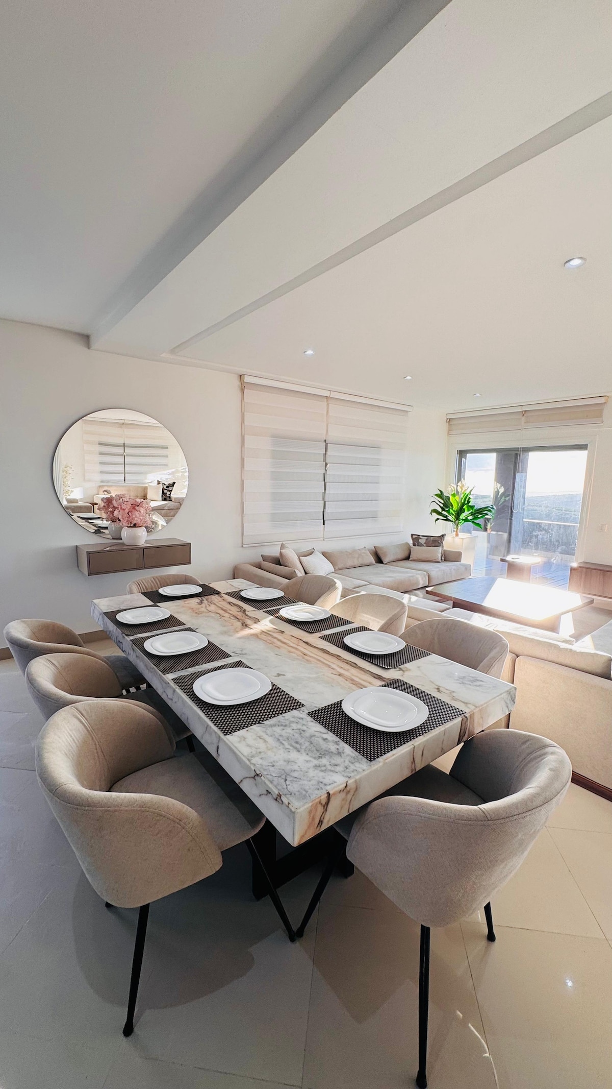 Penthouse moderne à thème blanc avec 3 chambres spacieuses et grande terrasse. Profitez du jacuzzi et du barbecue pour des moments de détente. Cuisine entièrement équipée et salon élégant avec une grande TV pour se relaxer. Idéal pour les familles, alliant luxe, confort et emplacement privilégié à Malabata. 📍 Service de transfert aéroport/gare disponible sur demande (Service payant non inclus dans le tarif).