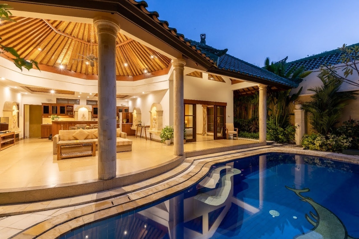 Նոր շքեղ լողավազան վիլլա Jimbaran լողափ, ինչպես նաեւ ջանքերը ազատ հեշտ մուտք դեպի օդանավակայան. Լիովին կահավորված և կահավորված, զարդարված բալիական ինքնատիպ արվեստի գործերով: Առանձին 10 մ լողավազան, Wi - Fi, Netflix, շրջապատող ձայնային ժամանցի համակարգ, լվացքատուն ։ Օդորակիչ վիլլայի ողջ տարածքում ։ Վայելեք տեղական ծովամթերքով, մասնակցեք զարմանահրաշ մայրամուտների կամ հանգստացեք լողավազանի մոտ ։ Գերազանց ռեստորաններ և բարեր մոտակայքում ՝ առանց խցանումների, Քութայի, Սեմինիակի և Լեգիան ։