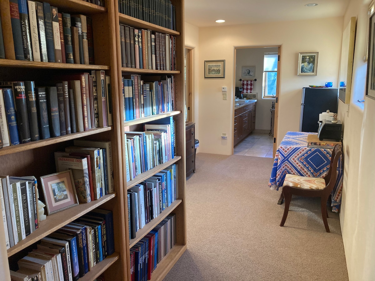 This beautiful downtown studio space w/ queen bed, avail monthly+, is one block from the heart of Taos plaza but secluded and quiet. The room is behind my 1936 historic home sharing a courtyard and ample parking space. It is ~325 sq ft with hardwood floors, adobe walls, and full bath. Tastefully furnished, you will enjoy a kitchenette with access to shared patio and grill, with fenced yard. From this downtown location you can walk to restaurants, museums, theater, galleries, and shopping.