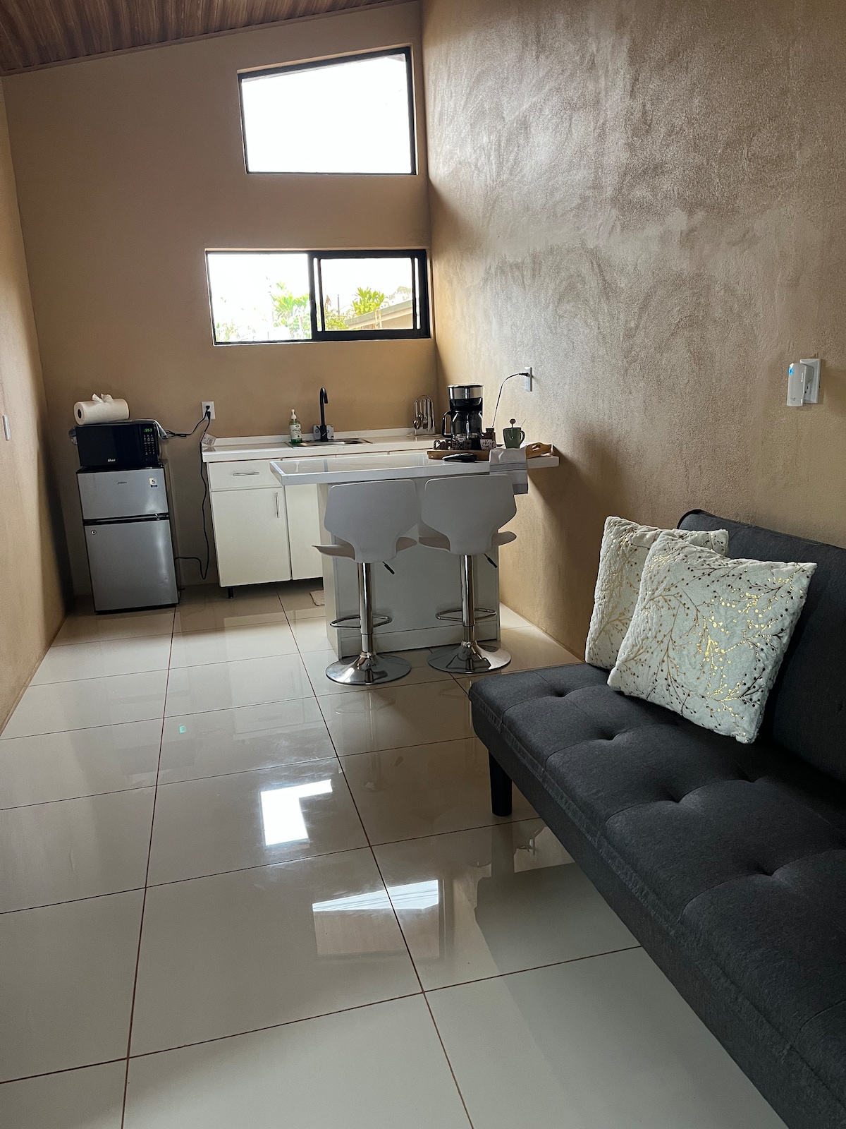 This is a clean little mini home self contained, secured with easy access , with 2 beds, kitchenette, table and chairs, bathroom, great for the traveler that wants to get out and see the country and not spend a lot of time sitting around, its basically a place to lay your head, and keep your belongings as your sight seeing CR, for a small fee, you can use the pool $25/day, and have maid service for cleaning, making beds etc.
