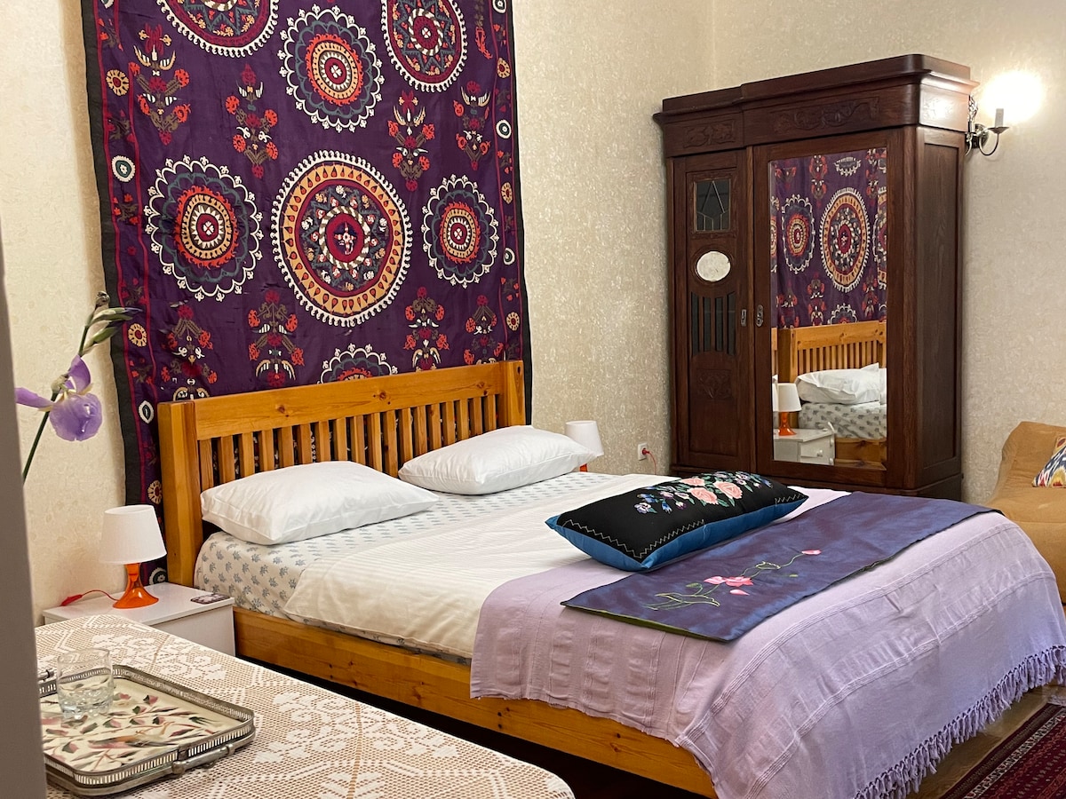 This special place is close to everything, making it easy to plan your visit. It’s a unique traditional Uzbek home decorated with some most beautiful antique and vintage handmade silk suzanis (embroidered wall hangings), a stylish, comfortable and peaceful place facing the back garden with some mature fruit trees and beautiful flowers.