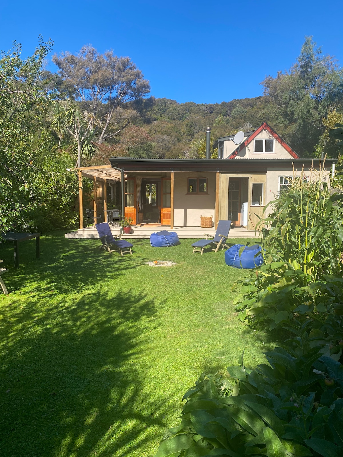 Sitting top a small hill with glorious bush & mountain views is our cottage nestled in a private garden, full of tuis, bellbirds, pigeons, fantails and quail. Full kitchen with everything you need Hooded BBQ All linen provided A huge deck with outdoor dining and a spa, glorious at night watching the stars and sipping your wine. BBQ & Fire Pit Fish Table A quick stroll along the inlet gets you to the main town of Collingwood with cafes, Tavern, general store, post shop & boat ramp & beach.