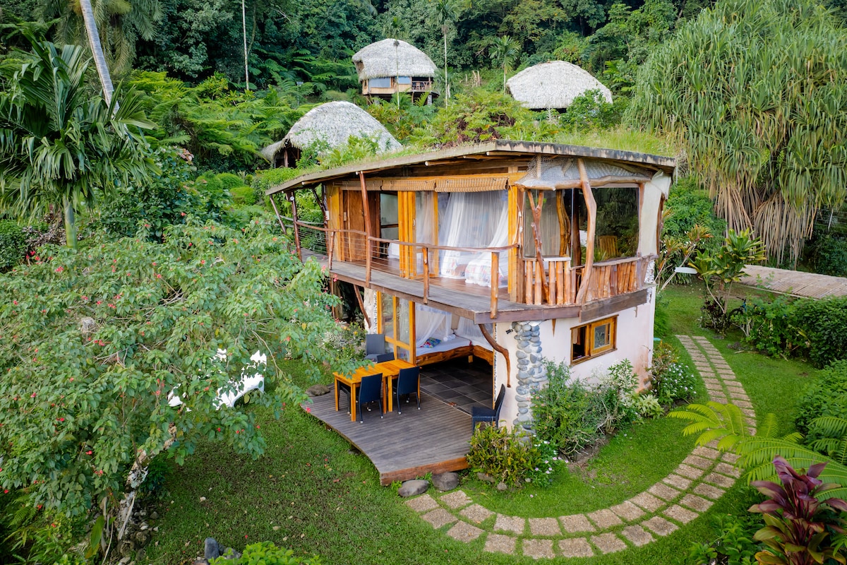 Իմ փայտե և բամբուկե տունը լի է հմայքով ։ Բաց է բավականին անտառապատ հողակտորի համար ։ Այն զարդարված է արվեստով, որը հայրս պատրաստել է լողափին ։ Ջերմ է, այն ցնցվում է մոտակա խութի ալիքների սերֆինգով ։ Կետերի սեզոնին մենք տեսնում ենք, թե ինչպես են ծովախեցգետինները ցատկում ծայրահեղ խութից մի քանի մետր հեռավորության վրա ։ Մեր լողափը հիշեցնում է ատոլներ իր շլացուցիչ մարջաններով, մինչդեռ սպիտակ ավազե լողափը շատ մոտ է (5 րոպե ոտքով): Բարի գալուստ Թեմե ։