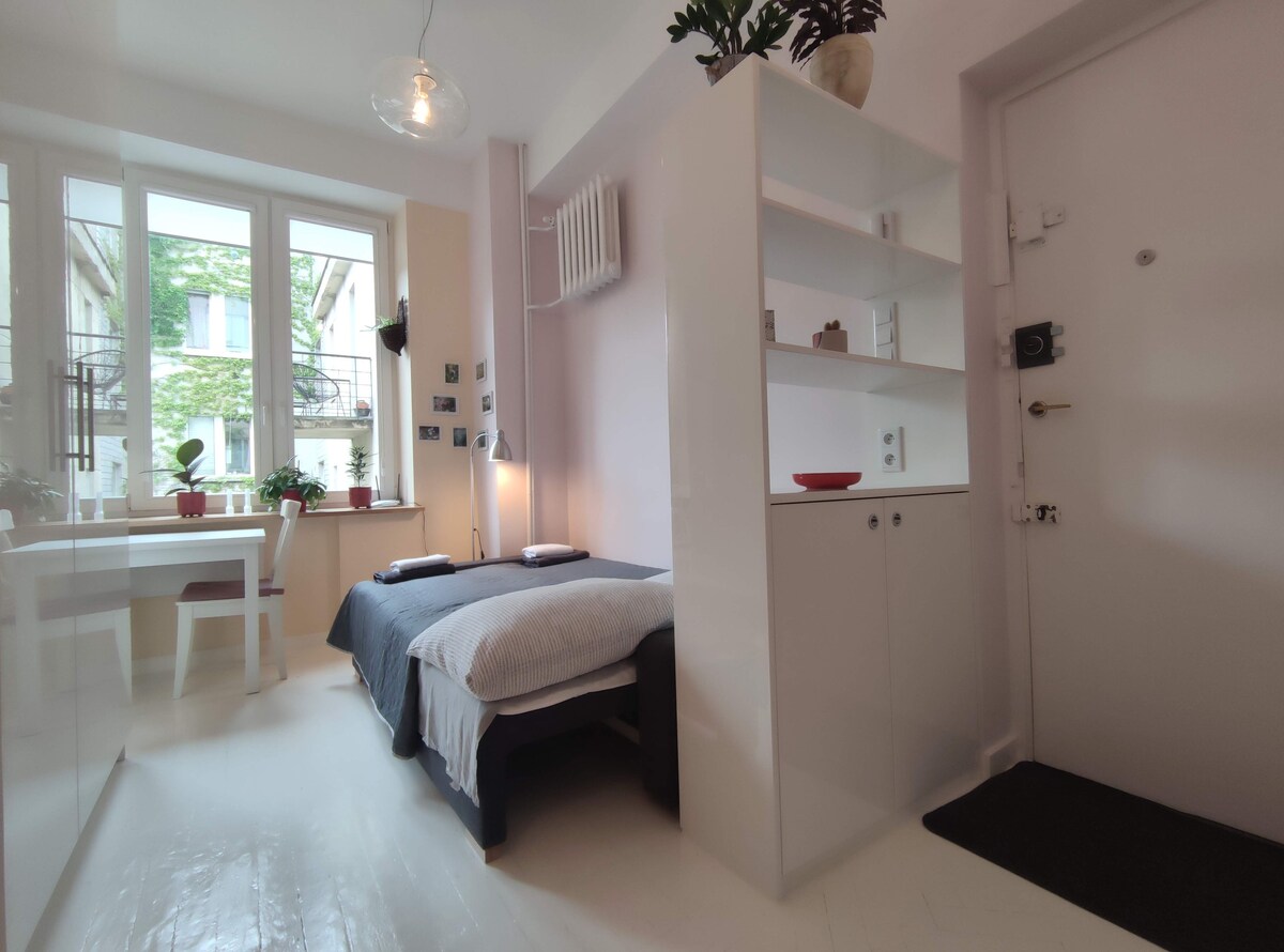Beautiful, minimalistic, fully equipped, bright, high-ceiling and freshly renovated studio in the very heart of Warsaw. The flat is located next to the Zbawiciela square, one of the best known places in the city. It is situated in a historic town house from 1950s which is a part fo iconic MDM Warsaw district. It's a perfect place for a single/couple who loves living the city life. The surroundings are often called 'the Paris of Poland' due to the magnificent architecture and local lifestyle.