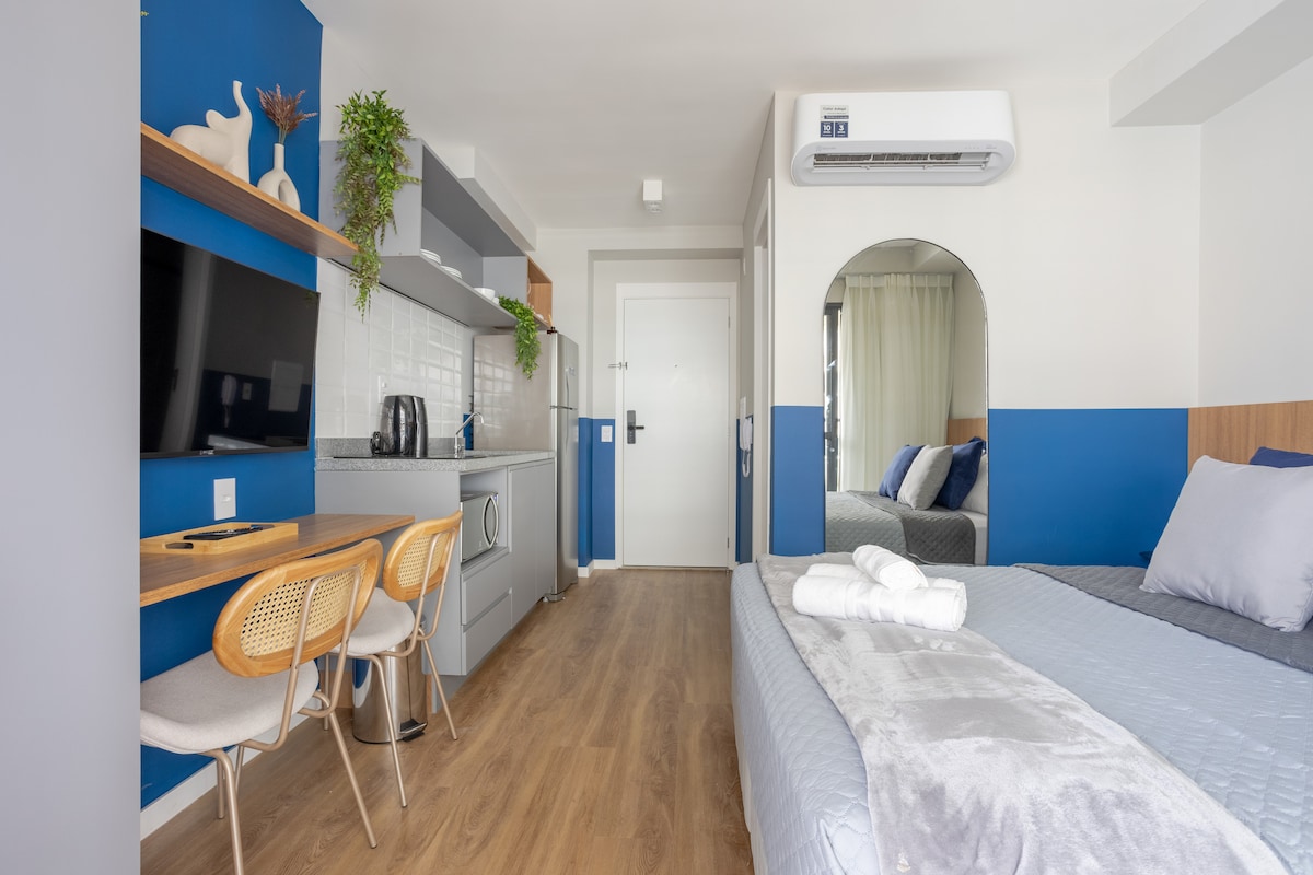 Ամբողջական և հարմարավետ ստուդիա Բրուքլինի Zip համատիրությունում, ընդարձակ և իդեալական առավելագույնը 3 հյուրի համար։ Այն ունի երկտեղանի մահճակալ և լրացուցիչ մեկտեղանի ծալվող մահճակալ, որտեղ բոլորը կարող են հարմարավետ կերպով տեղավորվել։ Այն ունի պատշգամբ, կահավորված խոհանոց և ամբողջական սպիտակեղեն՝ գործնական և հաճելի այցի համար։ Գտնվում է Բրուքլինի թաղամասում (Վիլա Կորդեյրո)՝ հանգիստ և հարմար տեղում։ Կոնդոմինիումն առաջարկում է մարզասրահ և լողավազան, որոնք հասանելի կլինեն * 2026 թ. մարտի 20-ից* :)