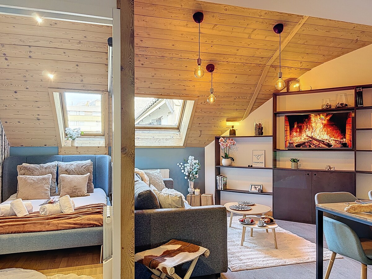 Վայելեք այս խաղաղության ապաստարանը ՝ Aiguille du Midi - ի և Mont Blanc - ի համայնապատկերային տեսարաններով: Դուք կզգաք, որ շրջապատված եք բնությամբ ՝ շնորհիվ ստուդիայի ստորոտում գտնվող այգու և գետի ։ Հետիոտնային փողոցից, ավտոբուսի կայարանից և գնացքի կանգառից ընդամենը 6 րոպե է հեռու, Aiguille du Midi մալուխային մեքենայի մեկնումից 10 րոպե: Կարող եք ձեր տրանսպորտային միջոցը թողնել մասնավոր ավտոկանգառում և վայելել հովիտը սպասարկող անվճար ավտոբուսները: