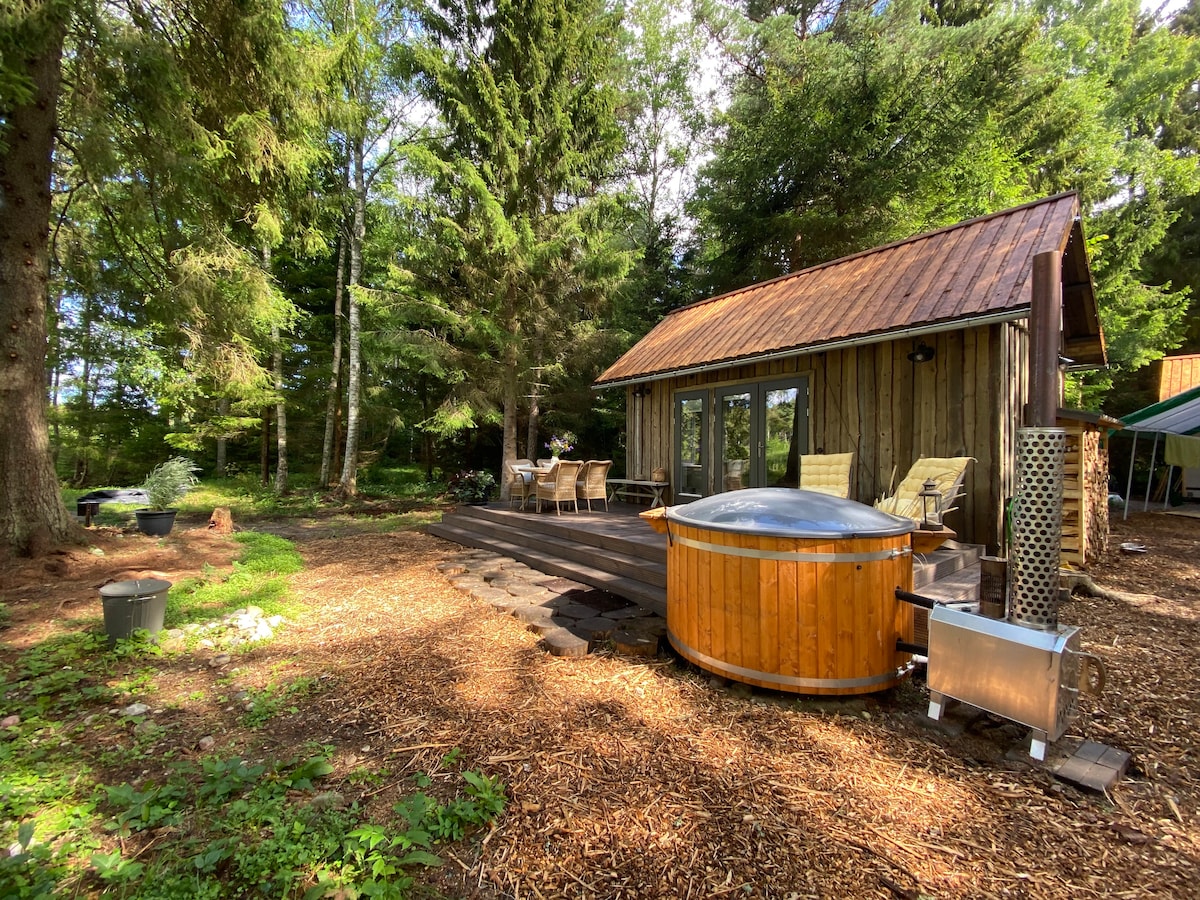 Enjoy extras: hot tube (€39-59€), sauna (€30), cocktail bar, hookah (€20), hanging tents for unique sleeping experience (€15) caravan for trips, and fresh seasonal garden products. The cozy cabin sleeps 4 (double bed 120 cm+ sofa bed), extra mattress for 5th guest. Kitchenette includes cooking essentials, coffee, and spices. Fireplace and air heat pump (AC) for extra comfort.