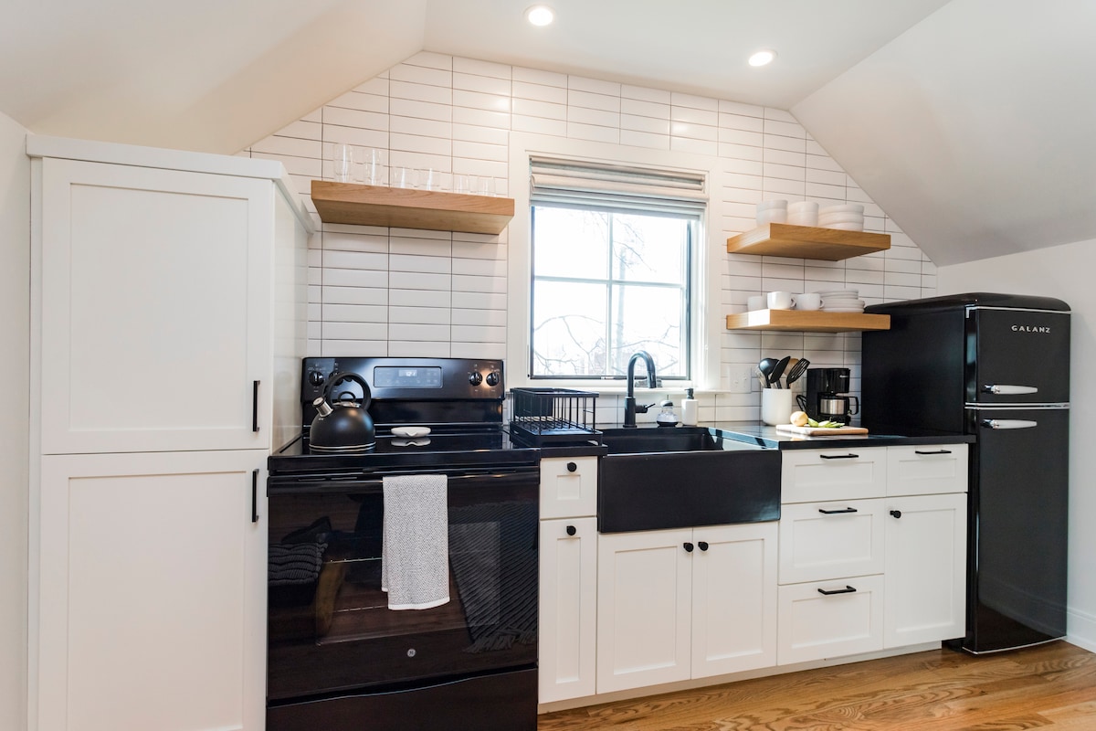 Enjoy a cozy, yet modern, centrally-located private guesthouse! Within a short walk to many bars, shopping, restaurants, grocery stores, and coffee shops! And only a 10 minute Uber to downtown Nashville! This new guesthouse boasts modern amenities, comfy beds, and offers plenty of space to relax. It sits atop a garage on our property and is located on a quiet street in a bustling neighborhood! Downtown/Bridgestone/Stadium - ~3 miles Restaurants/Shops - Many options within 2 blocks to 1 Mile