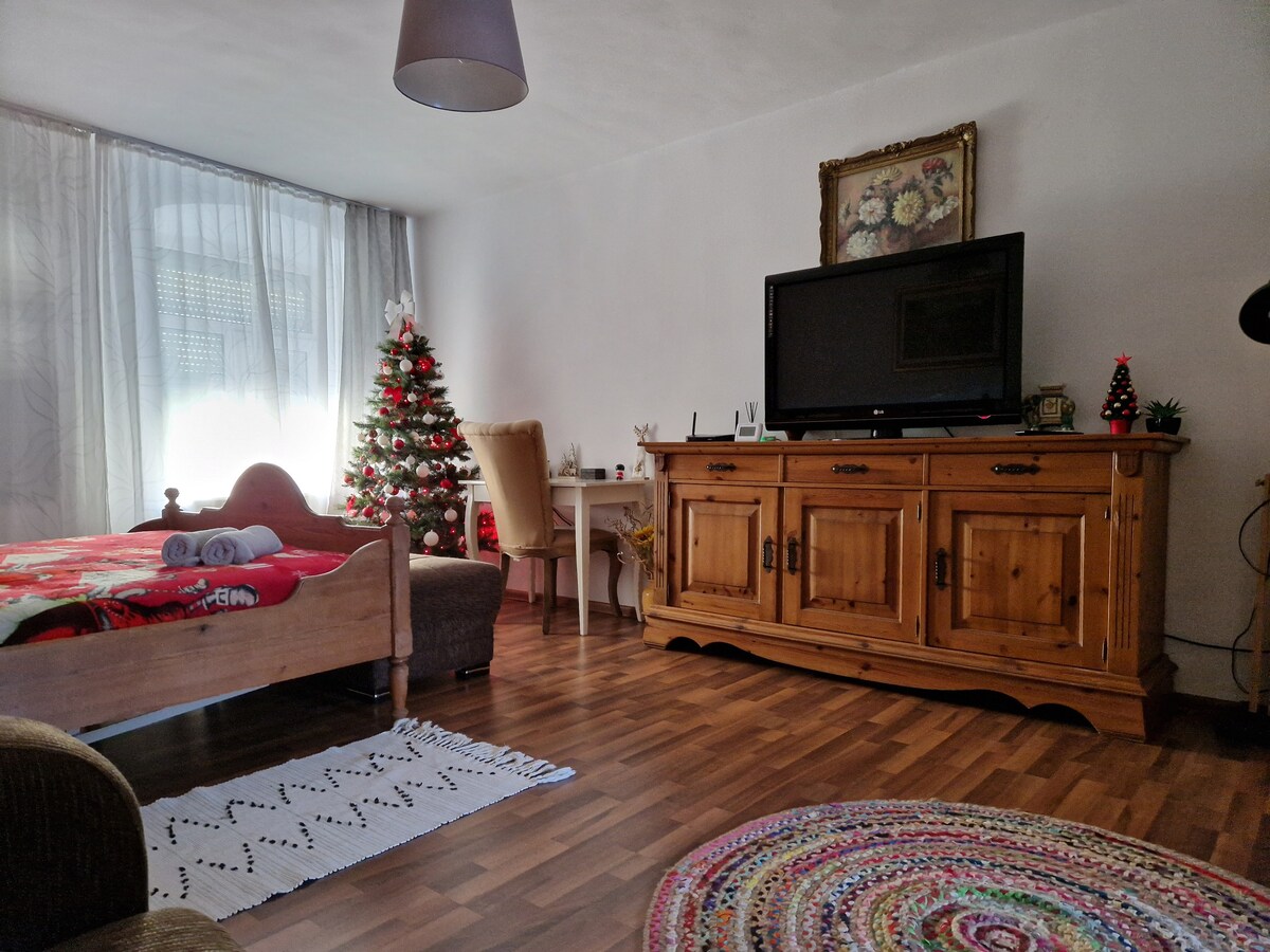 Our apartment is just steps from Piata Mare (Grand Square) in Sibiu. Located in a 200-year-old historic building, it features a cozy bedroom, living area with smart TV (Netflix), fast Wi-Fi, and a fully equipped kitchen with coffee maker, stove, and washing machine. Central heating keeps things warm in winter, and A/C is available during summer. A small private terrace adds extra charm—perfect for relaxing after a day of exploring the city.