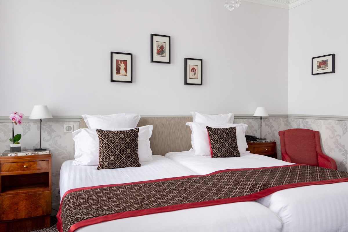Twin room with private bathroom in the Hotel Malte****, Astotel 4-star boutique hotel ideally located in the heart of the 2nd arrondissement of Paris, near the Bourse (stock exchange), the Louvre museum, the Palais Royal, the Opéra Garnier and public transportation. 24/7 reception. Possibility of free luggage deposit all day on arrival and departure days.