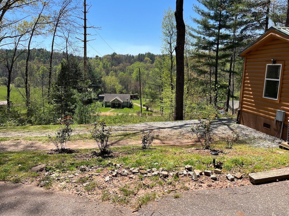High Country Haven Camping and Cabins is a beautiful back to nature mountain experience. Located in Franklin NC 7 mins to downtown. 35-45 minutes to Bryson City, Dillsboro and Sylvia. This 1 bed queen 1 full bath with shower and tub. This cabin perfect getaway for a clean and cozy stay! Full kitchen, dining room and living room. Can sleep extra people on couch or queen air mattress for loft short ceiling good for kids. You will find cabin lodge decor welcoming to the mountains for your stay.