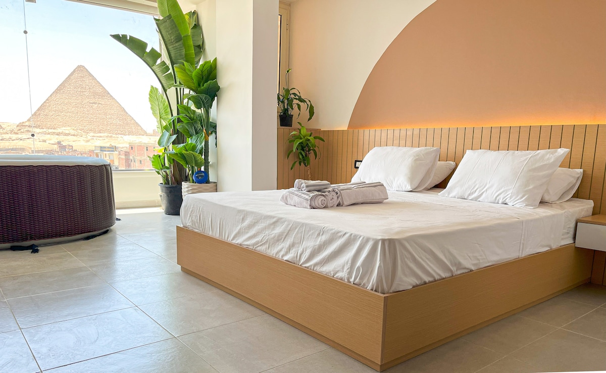 Հանգստացեք առանձին լոգարանում ՝ ձեր պատուհանից վայելելով Մեծ բուրգերի ցնցող տեսարանը ։ Այս նորաոճ ստուդիան կատարյալ է զույգերի կամ միայնակ ճանապարհորդողների համար ՝ առաջարկելով հարմարավետություն, առանձնություն և խաղաղ մթնոլորտ ։ Հարմարավետ մահճակալով, ժամանակակից լոգասենյակով և անմոռանալի տեսարանով ՝ այն յուրահատուկ հանգիստ է բուրգերից ընդամենը մի քանի րոպե հեռավորության վրա ։ Փորձեք Գիզան, ինչպես երբեք ՝ շքեղությամբ և պատմությամբ ։