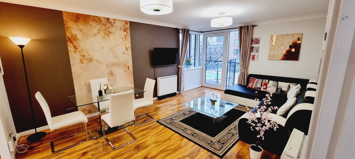 O2 Arena - ում տեղակայված շքեղ և ժամանակակից 2 սենյականոց բնակարանն այն ամենն է, ինչ անհրաժեշտ է ՝ արդյոք այցելում եք Լոնդոն բիզնեսի կամ հաճույքի համար: Այն ունի գեղեցիկ ձևավորված բաց հատակագծով խոհանոց, հյուրասենյակ, ընդարձակ պատշգամբ ՝ զարմանալի տեսարանով, մեկ en - Suite ննջասենյակ և երկրորդ ննջասենյակ: 3 րոպե քայլեք դեպի O2 Arena և 1 րոպե քայլեք դեպի Էմիրաթ ճոպանուղի N Uber նավակ, որը հիանալի միջոց է ապահովում բոլոր Լոնդոնի համար: Այս հատուկ վայրը մոտ է ամեն ինչին, ինչը հեշտացնում է ձեր այցը պլանավորելը
