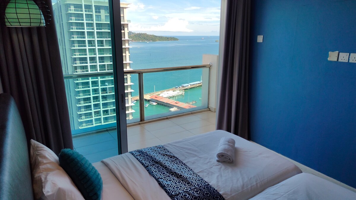 Stunning Sea view from the house. Chilling at the balcony. Swimming pool@level 6 Living Room, Queen Size bedroom, private sofa bed corner with curtains. Ensuite bathroom with hot and cold water shower. Large refrigerator with ice cube , mini kitchen with electric cooker, pot,plate,spoon,fork are available . Light cook at the kitchen. Filter water machine hot and warm. Please select 3 guest if you need single bed setting convert from sofa bed.
