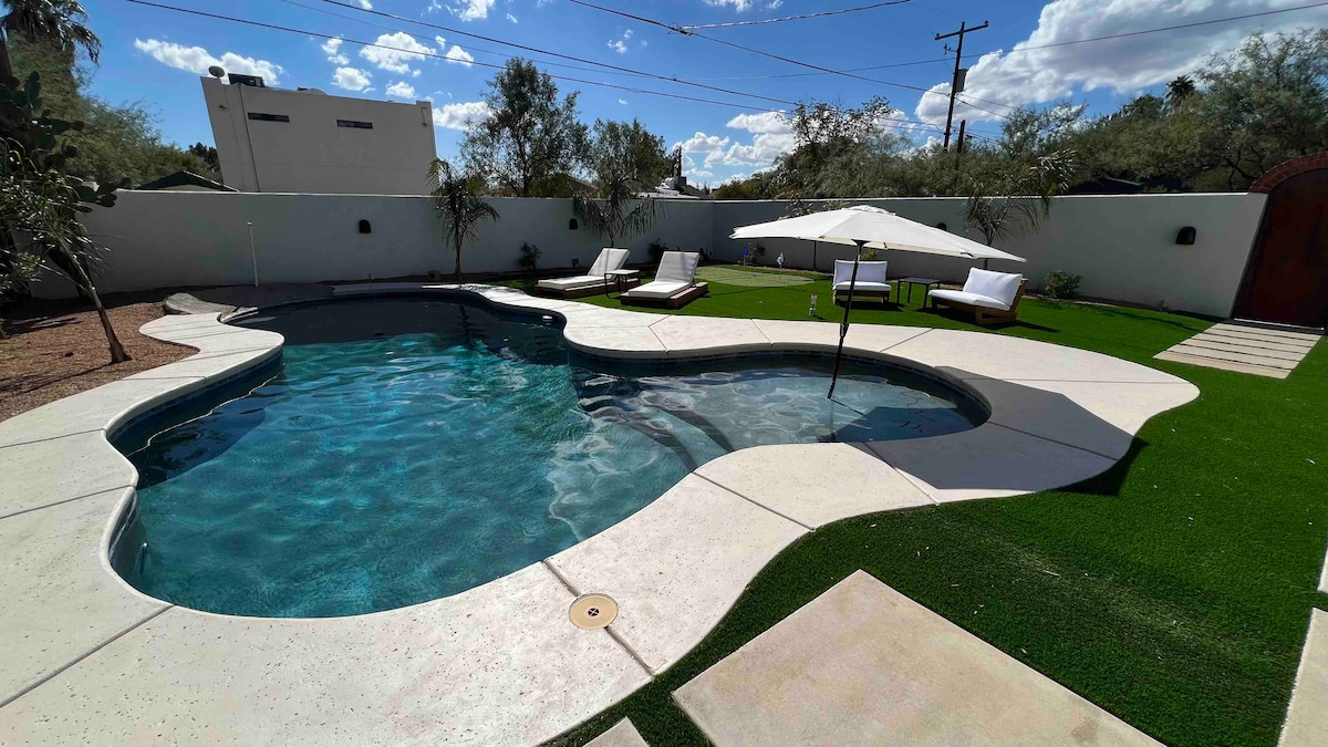 Արևմտյան Մունում վայելեք մասնավոր հանգիստ Թուսոնի պատմական թաղամասերից մեկում ՝ Բլենման Էլմում ։ Մեր վերանորոգված տունը քնում է 8 հոգով ՝ ներքին և արտաքին տարածքներով, որոնք նախատեսված են ջերմ և հյուրընկալ լինելու համար ՝ միաժամանակ կենտրոնանալով ներսի/բացօթյա ապրելու և գեղեցիկ եղանակի վրա, որով մենք հայտնի ենք: Ամբողջ օրը խաղացեք մասնավոր լողավազանում և վայելեք երեկոյան խորովածները հետնաբակում ՝ բացօթյա ճաշկերույթներով, հարմարավետ նստատեղերով և լարային լույսերով ։ Կատարյալ է խմբերի և ընտանիքների համար ։ Մենք նախագծել ենք այս տարածքը ՝ հաշվի առնելով ձեր հաճույքը ։