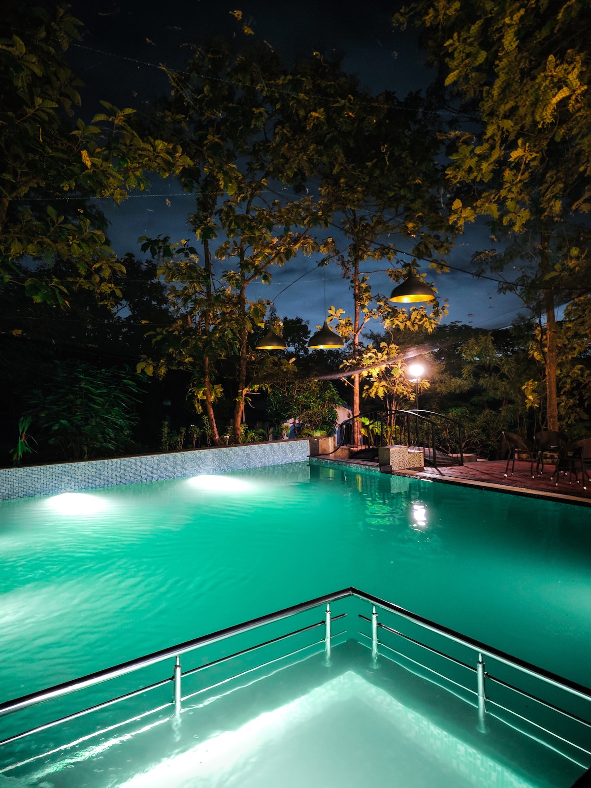 Escape to a spacious Santorini-inspired cabin in the woods, featuring a jacuzzi with a roof that opens to the sky. Cozy up with chilled drinks from the mini-fridge as you watch your favorite movies, or step out to explore the property which is stretched out across an acre of lush green Teak Forest ("Sag-Wan" in Marathi) featuring one of the most unique pools you’ll ever experience. We welcome you to surprise your partner with the most perfect romantic luxurious getaway in the forest!