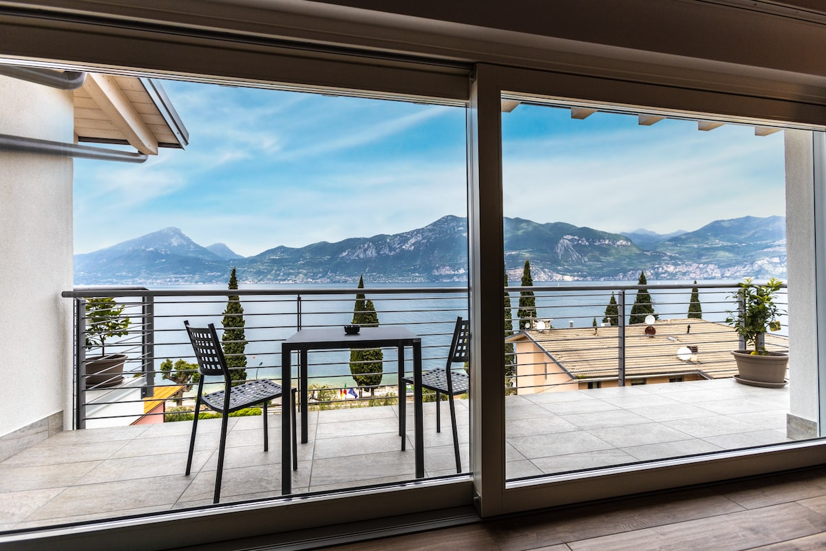Trilocale con splendida vista lago, con terrazza o balcone, edificio completamente nuovo con garage, ascensore, cucina attrezzata, mobili da esterno, spiaggia5 mt con sdraie a disposizione. Possibilità di fare una colazione continentale in terrazza a 10.00 € a persona. Tassa di soggiorno extra 1.50 Euro a persona al giorno, aria condizionata e cane € 10..00 al giorno a richiesta