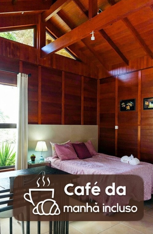 Cabana confortável no meio do mato, com amplas janelas e varandas. Viva a sensação de estar numa casa na árvore. Planejada para se viver momentos únicos de conexão com a natureza. Você pode caminhar nas trilhas, pescar, andar no pedalinho, curtir o pôr do sol no Mirante da propriedade, fazer um piquenique no déque sobre lago ou simplesmente relaxar imerso na banheira de hidromassagem, na varanda, na cama ou no sofá, se aquecendo nas lareiras. Domingos check-out cortesia até às 18h.