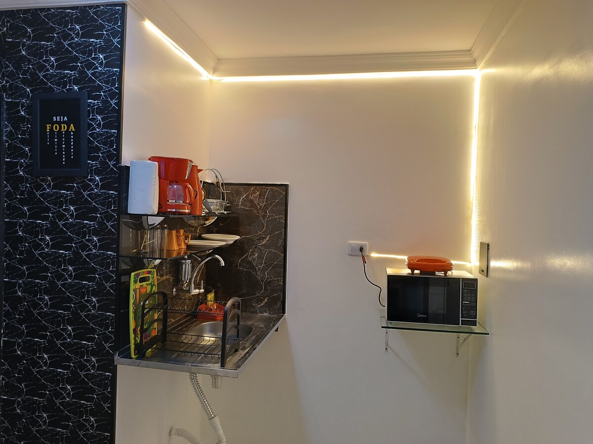 Acomoda-se com conforto até 2 pessoas em FLAT STUDIO - 1 quarto com cama Queen. Há ainda um sofá-cama individual ao lado da cama Queen para o caso de um terceiro hóspede, para hospedagens curtas. Cozinha americana completa (eletrodomésticos, louças e panelas) integrada à sala. Outros utensílios como secador de cabelo, tábua e ferro de passar estão disponíveis.