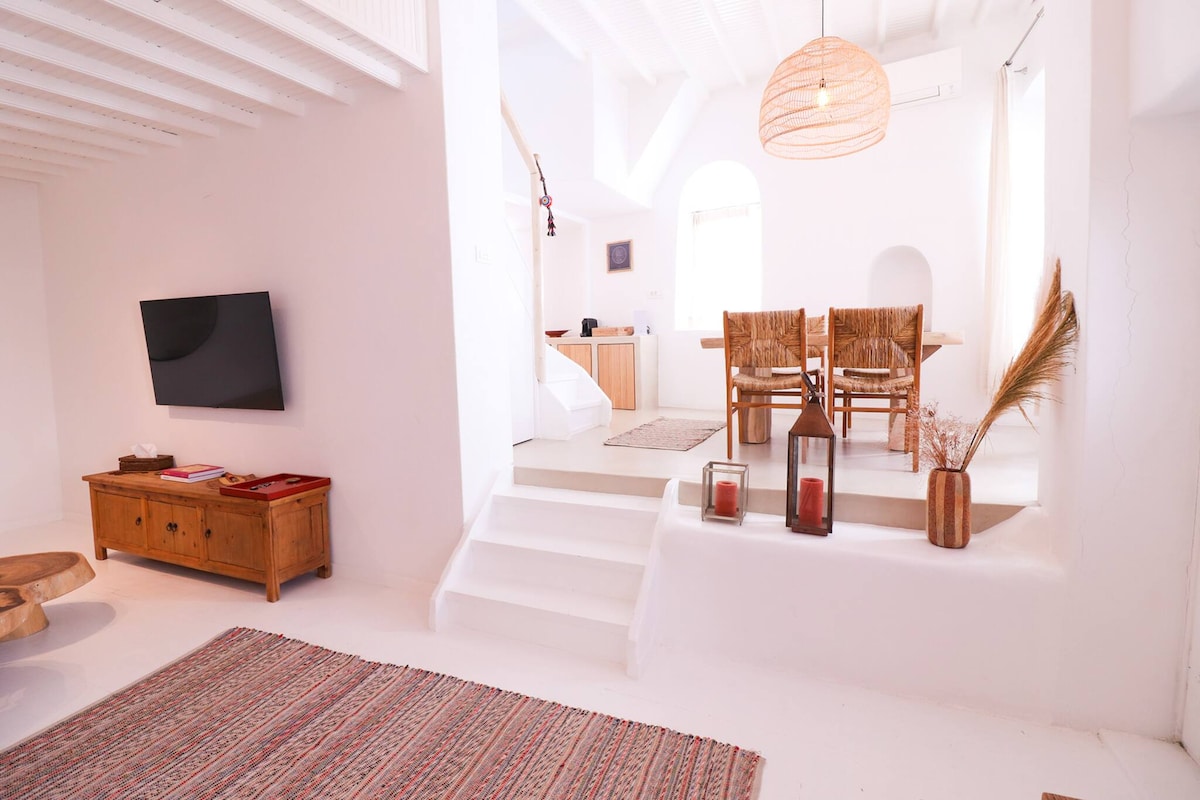 Studio apartment with all the essential amenities and at the best possible location! Heart of Mykonos town but on a quiet alley! All major attractions (windmills, little Venice, Old port), all necessities (markets, buses, taxis, ATMs) and all the fun (restaurants, sunset bars, night clubs and the small beach of town) are all just a few minutes walk!!!