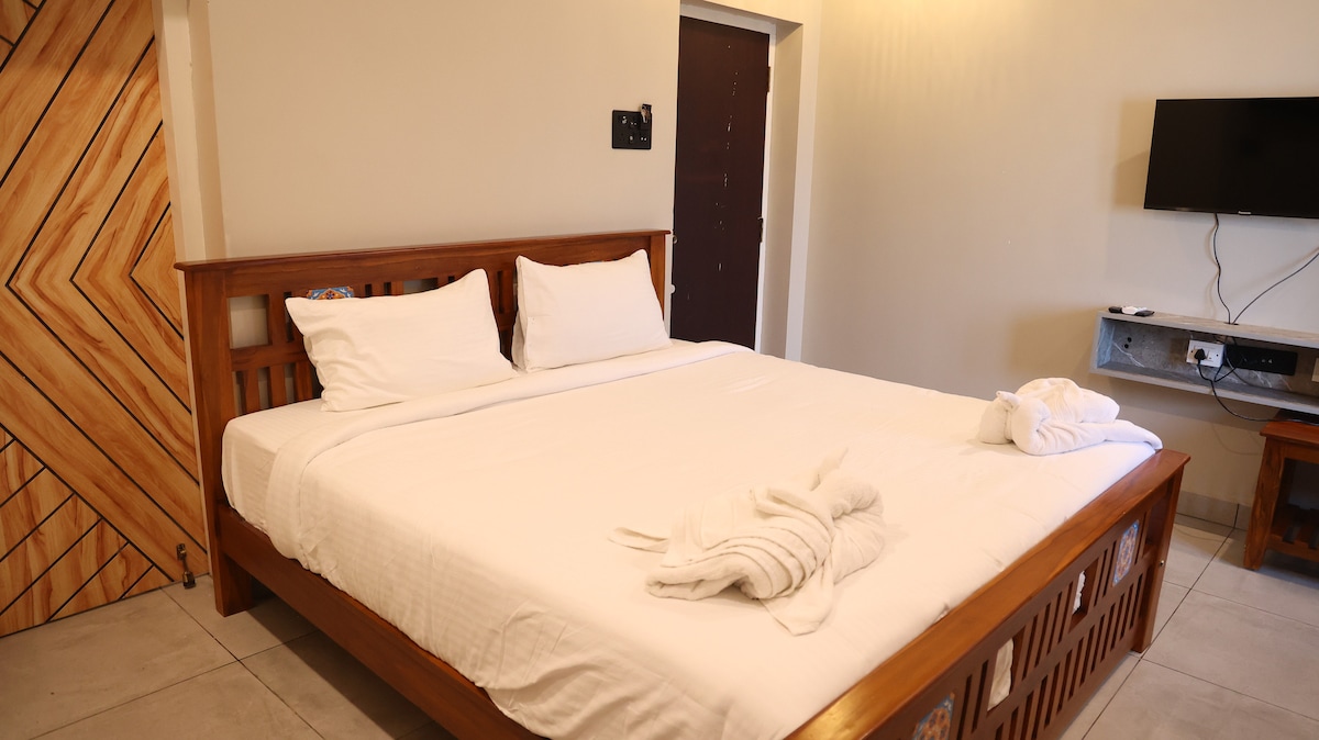 The room features a comfortable wooden double bed with premium white linens and equipped with air-conditioning and flat-screen TV. Additional features include a spacious wardrobe, dressing table, study chair, electric kettle with tea/coffee setup, and a clean attached bathroom. Warm lighting and tasteful décor enhance the cozy ambiance, making it ideal for couples, families, and leisure travelers. Perfect for guests seeking comfort, cleanliness, and scenic surroundings in a homely environment.