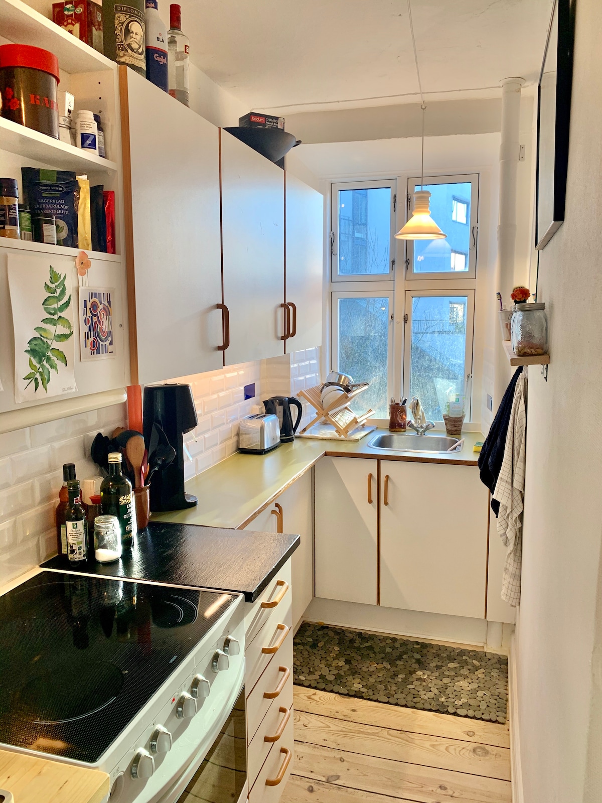 Մեր բնակարանը մարգարիտ է հենց Կոպենհագենի մեջտեղում ։ Այն իսկապես կատարյալ վայր է Կոպենհագենն ուսումնասիրելու համար. այն հարմարավետ, լուսավոր տարածք է, որտեղ կա այն ամենը, ինչ ձեզ հարկավոր է, և Կոպենհագենի բացարձակ լավագույն վայրում ՝ երիտասարդ և հիփ, բայց միևնույն ժամանակ շատ ընտանեկան: Մենք գնեցինք հարևան բնակարանը, որպեսզի միջանցքում պատի մեջ դուռ լինի, բայց այն միշտ կողպված է, և տարածքը լիովին առանձին է ։