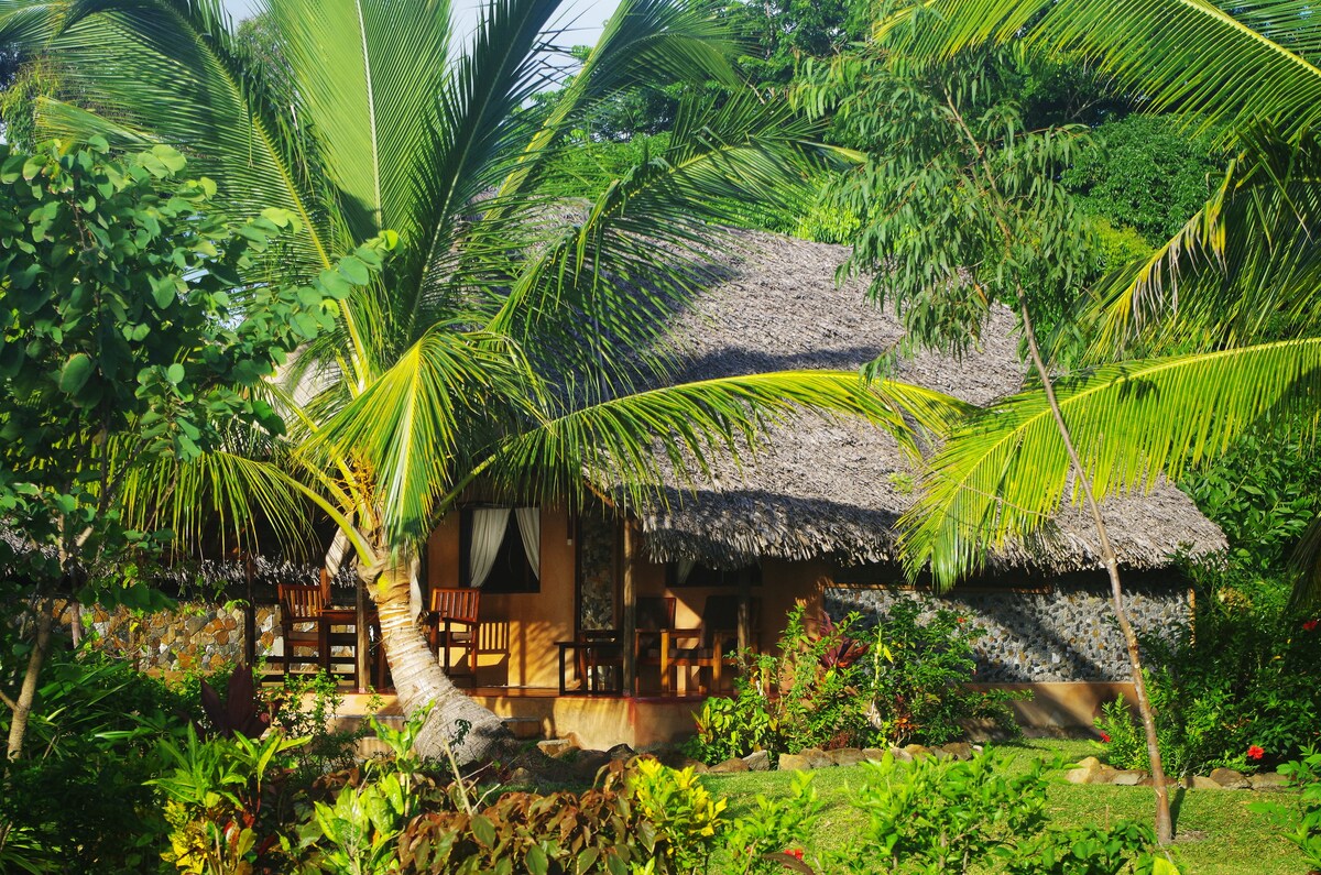 Very nice and typical bungalow in a large tropical garden. A private natural pool for exceptional baths in warm blue and fishy Indian Ocean water. On the property: a panoramic restaurant for meals. Wifi, laundry service, excursions...