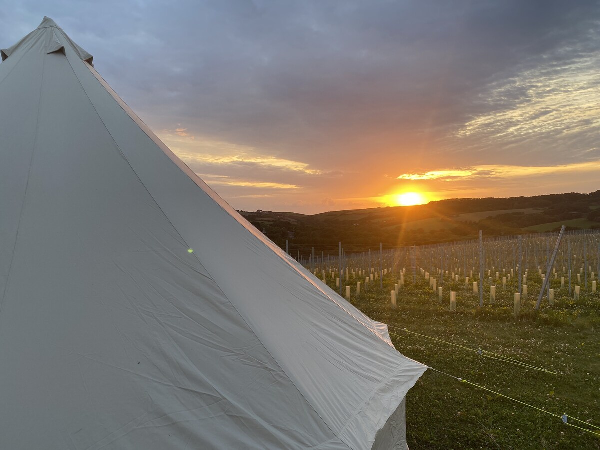 Tranquil glamping in the middle of nowhere. Enjoy peaceful country sounds & views in this unique place. Only 4 bell tents are on the Farm. There is a separate 400sq ft communal 'mess tent' for food prep, cooking & dining and a fridge freezer. We aim to provide low impact glamping. There are compost toilets, a solar powered shower, & washing up station. Phone charging Stunning views Peace and quiet Farm with Hens, Sheep and Cats Off the beaten track Situated on the Devon/Somerset border
