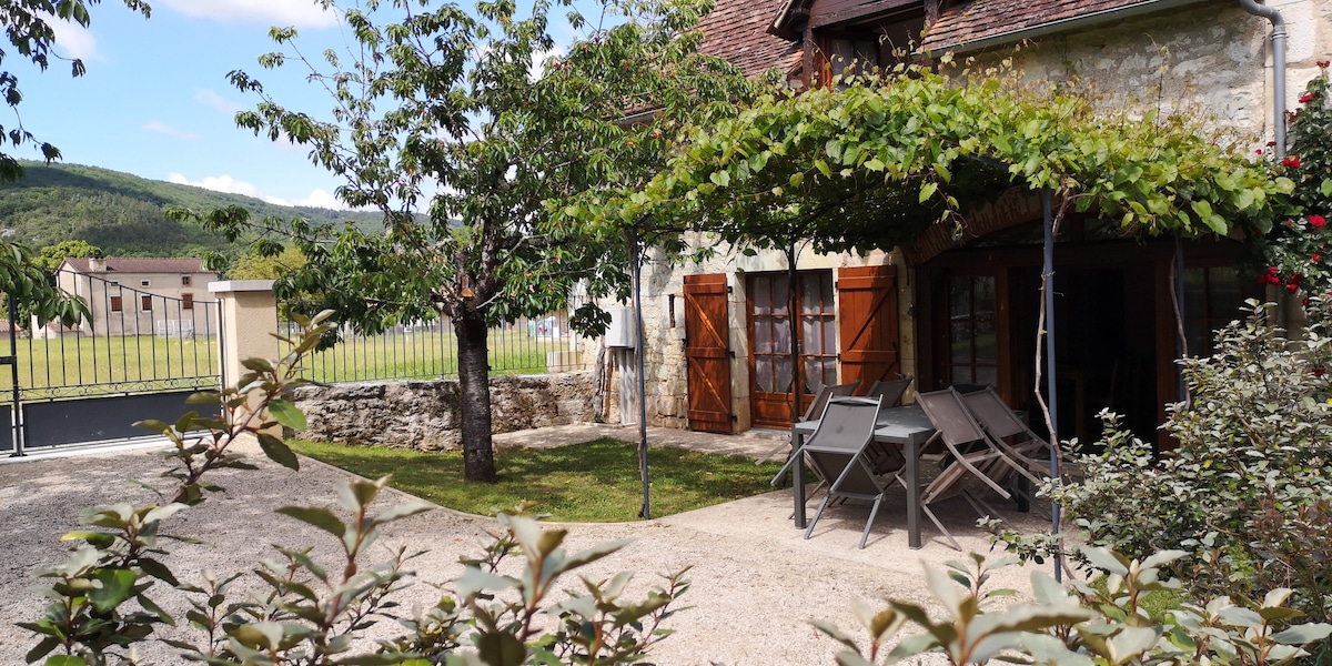 Jolie maison en pierre typique restaurée de la vallée du Lot, avec côté terrasse, forêt et falaise, et coté cour, vue sur la vallée du Lot. Située entre Saint-Cirq Lapopie et Cajarc, paysage typique des villages accrochés et des méandres du Lot. Nombreuses promenades, randonnées et visites alentour tels que Figeac, Cahors, Rocamadour, le gouffre de Padirac....