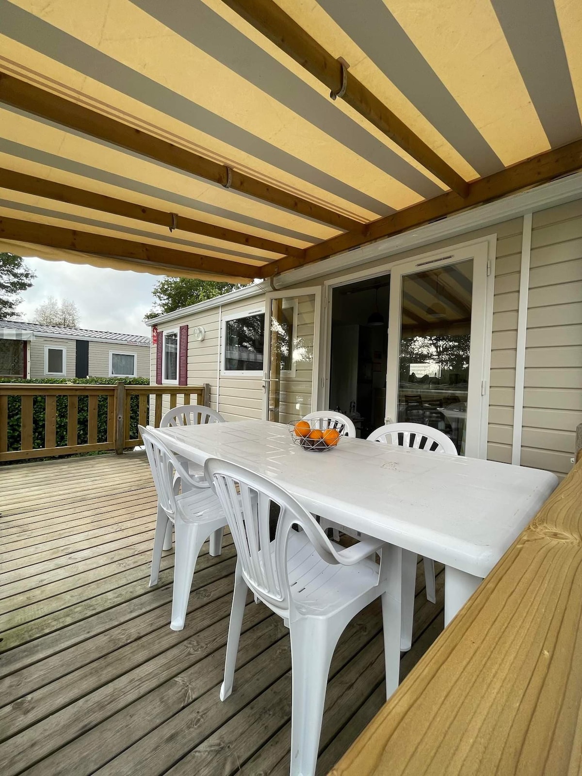 Մենք վարձակալում ենք 35 մ2 շարժական տուն 6 հոգու համար բարձրակարգ քեմփինգում, որը գտնվում է նկարիչների քաղաքի մոտակայքում (Պոնտ - Ավեն, Ֆինիստեր հարավ )։ Mobil - տունը բաղկացած է լիովին կահավորված խոհանոցից, որը բաց է դեպի հյուրասենյակ, 3 ննջասենյակ ՝ երկտեղանի մահճակալով և երկուսը ՝ մեկտեղանի մահճակալներով ։ Այս տունը գտնվում է ծովից 5 կմ հեռավորության վրա ։