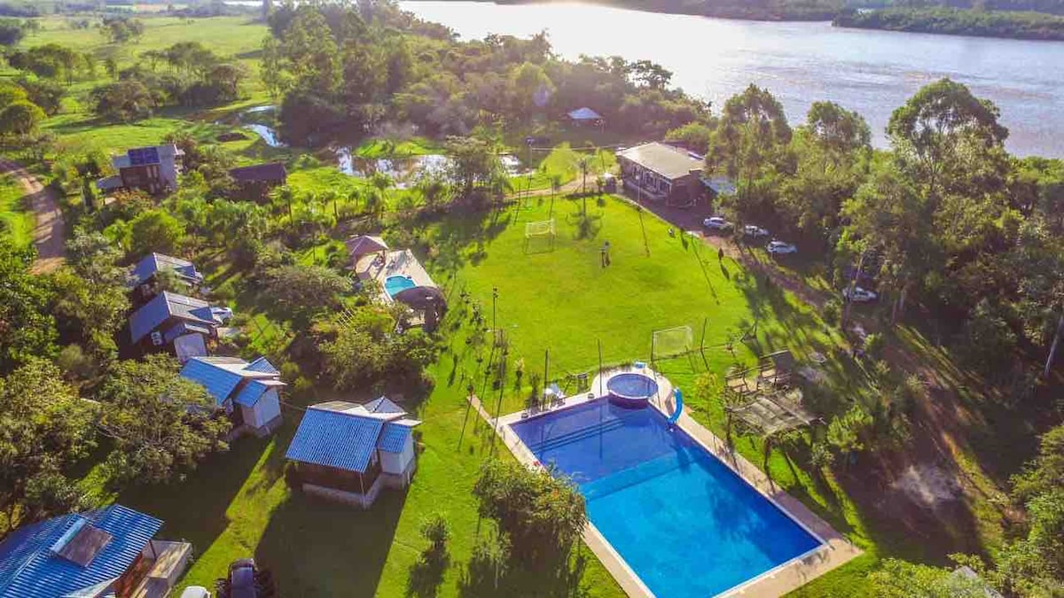Casas de campo, às margens do Rio Uruguai, com acomodação para 4 pessoas com piscinas, lago com pedalinho, pescaria esportiva, play , animais domésticos. Campo de futebol, quadra de vôlei, quiosques com churrasqueiras. Tudo em meio a uma natureza fantástica. Valor p/ pessoa com café da manhã incluso.