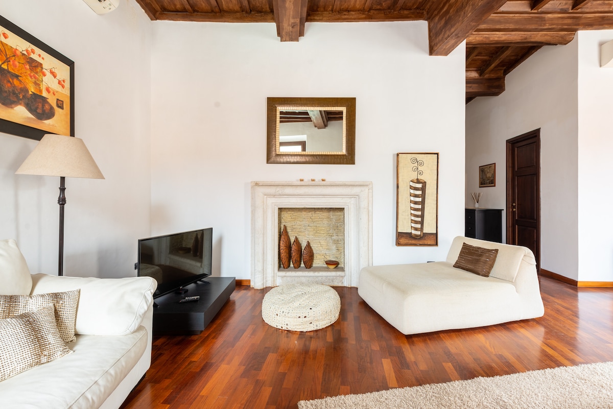 Light the large stone fire and relax with a book in this elegant home overlooking Via dei Banchi Nuovi. Coffered ceilings cap cozy rooms in relaxing, neutral tones accented by designer furnishings and owner's original paintings. This charming fully renovated house is located in one of the most beautiful, ancient and vibrant area of the center of the Eternal City. We also like to offer eco-sustainable hospitality: we use electricity from renewable sources, organic products.