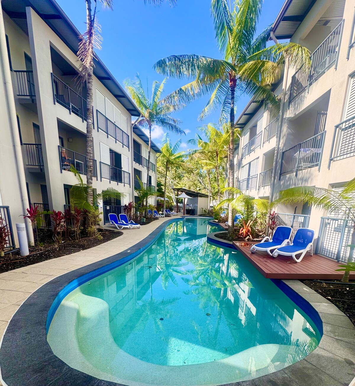Կլանեք արևի ջերմությունը 9 լողավազաններով, որոնք շրջապատված են փարթամ արևադարձային այգիներով, տախտակամածի աթոռներով և բարբեքյուներով, ինչպես նաև ներքին մարզադահլիճով, որը գտնվում է անմիջապես ձեր դռան կողքին ՝ այս մասնավոր հսկվող հանգստավայրի ոճով ։ Մեր նորաոճ բնակարանում տեղադրված են դիզայներական խալաթներ, սեղանի կարգավորում, շքեղ սպիտակեղեն, նոր բարձրորակ գրպանի ներքնակ, նոր սրճեփ մեքենա և լիովին հագեցած է կատարյալ այցի համար: Միայն 15 րոպե քայլեք դեպի քաղաքի կենտրոն, 20 րոպե ՝ դեպի Էսպլանադ, և 20 րոպե ՝ դեպի Կերնս առևտրի կենտրոն: