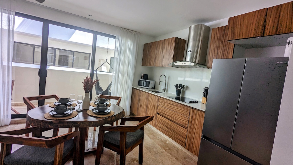 Այս ստուդիայի բնակարանը հարմար է մեր հյուրերի համար ՝ Թուլում քաղաքի կենտրոնում տեղական փորձառություն վայելելու համար, և, միևնույն ժամանակ, ընդամենը մի քանի րոպե հեռավորության վրա գտնվի իր կախարդական լողափերից և այն ամենից, ինչ առաջարկում է Թուլում հյուրանոցային գոտին ։ Մենք մտածում ենք յուրաքանչյուր մանրուքի մասին, որպեսզի բավարարեն բոլոր տեսակի ճանապարհորդների կարիքները ։ Անկախ նրանից, թե դուք գալիս եք արձակուրդ, թե/և աշխատում եք, մեր տարածքը ձեզ համար է ։ Այն գտնվում է Menesses Tulum - ում, մի վայր, որտեղ կգտնեք մարզասրահ, կինոսրահ, հանգստի գոտի, լողավազաններ և այլն: