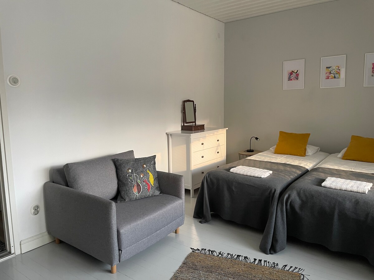 Նոր ստուդիա - բնակարան Տուրկու ամրոցի և նավահանգստի հարևանությամբ գտնվող գեղեցիկ միջավայրում ։ Քաղաքի կենտրոնից ընդամենը 20 րոպե հեռավորության վրա է գտնվում գեղեցիկ գետափը ։ Բնակարանն ունի այն ամենը, ինչ անհրաժեշտ է կարճատև այցի կամ ավելի երկար այցի համար, լիովին կահավորված խոհանոց, լոգասենյակ, նոր ավելի մեծ երկտեղանոց մահճակալ և հաճելի պատիո: Wi - Fi - ի հասանելիությունը կապ կհաստատի ձեր ուղևորության ընթացքում ։ Այժմ հյուրերը կարող են օգտվել նաև նոր հեռուստացույցից: Uusi yksiö lähellä Turun satamaa, kävelyetäisyyydellä keskustaan.
