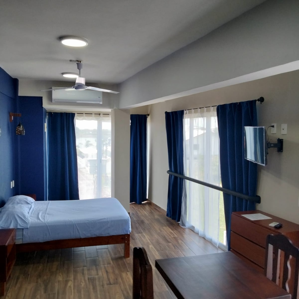 Limpio, a 15 minutos de la playa, 5 minutos del centro, aire acondicionado, 2 habitaciones con una cama matrimonial y una individual, sala, comedor, TV, refrigerador, estufa, 1 baño completo
